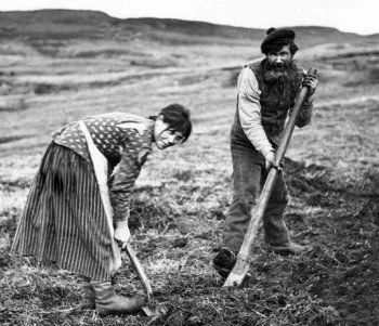 The islanders first turned the ground with an aschrom (foot-plough), then went over it very carefully with a harrow, removing every stone, root and weed. Their harrows were homemade affairs, mostly of wood but with long tangles of seaweed fixed on behind to scatter the earth.