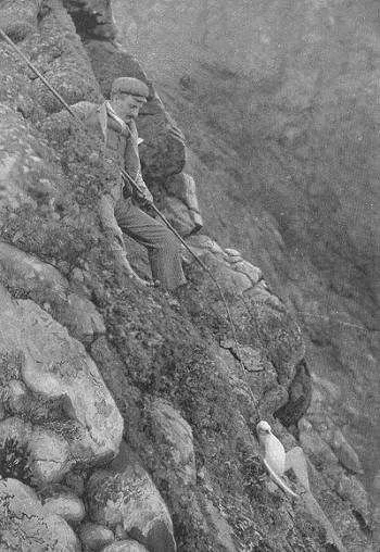 But first he would always make a careful examination of the ground at the edge of the cliff where his rope was to hang, making sure that it would not give way and that no loose stones could be dislodged by the movement of the rope. By working alone, he was sometimes able to reach more inaccessible parts of the cliffs, but he needed skill and strength to climb back up the rock with his catch and rod. If he ran into difficulties, he knew there would be no help available.