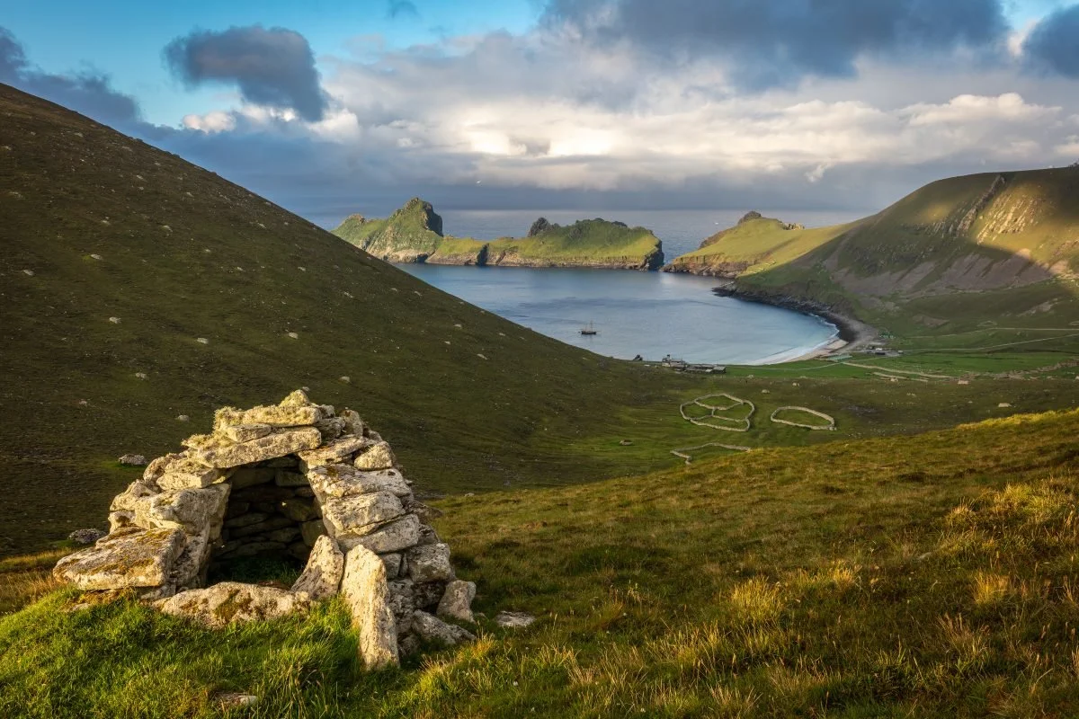 St Kilda is a remote archipelago situated 35 nautical miles (65 kilometres) west-northwest of Nort Uist in the North Atlantic Oceon. It contains the westernmost islands of the Outer Hebrides of Scotland. The largest island is Hirta, whose sea cliffs are the highest in the United Kingdom; three other islands (Dun,Soay and Boreray) were also used for grazing and seabird hunting.